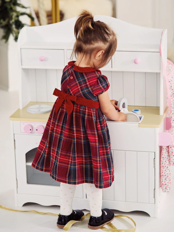 - Tartan dresses and pinafores – charming choices for girls.