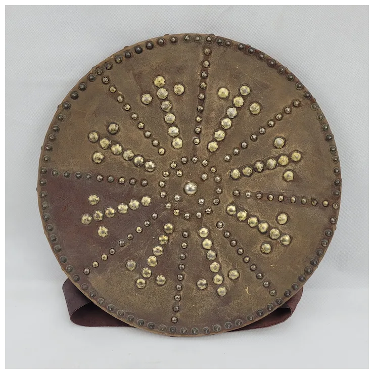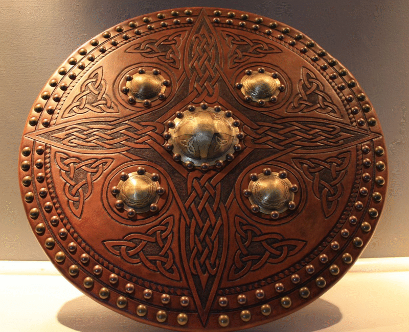 The word targe comes from the Old French targe meaning “shield.” In Scottish tradition, it referred to a round defensive shield, usually 18–21 inches in diameter, crafted from wood and reinforced with leather and metal studs. Many targes were decorated with intricate Celtic patterns, not unlike those found in Celtic stone carvings.